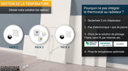 Nous proposons ci-dessous des exemples non exhaustifs de solutions de gestion de la température. Vous pouvez également choisir d’acquérir un système de gestion de la température auprès d’un autre fournisseur de votre choix, en veillant simplement à choisir une solution compatible avec les radiateurs Heat4all (contact sec, sans fil pilote) et avec votre installation. Les solutions de gestion de la température présentées le sont à titre indicatif, sur la base des données communiquées par les fabricants. La conformité, la compatibilité finale et la mise en œuvre des équipements relèvent exclusivement du professionnel chargé de l’installation.